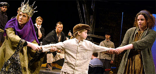 瞧!阿茲達克採用古人使用過的灰闌審案法,讓孩子站在石灰畫成的圈子中間,爭子雙方各朝相反方向同時牽拉孩子,誰拉過去,孩子就歸誰。總督夫人的律師知道,他的當事人弱不禁風,而對手卻是習慣於體力勞動的,他提出抗議:一個有大筆遺產的孩子的命運不應取決於一次不可靠的角力。但是,法官既然決心已下,就得照著辦。格魯雪還沒拉住孩子,總督夫人已經搶先拉住。法官宣布第一次無效。體格強壯的格魯雪,在保護、養育孩子的過程中,對孩子產生了深厚的感情,她怎麼忍心使勁拉孩子呢?所以第二次她又鬆手了,孩子被總督夫人狠命地一把拉了過去。這時,人們聽到格魯雪絕望的呼號:“他是我養大的!我能把他撕了嗎?我不干!”看來孩子要回到他的生母那邊去了,但是出人意料,法官判決總督夫人敗訴,同時干脆把敗訴的總督家的財產充公,從中撥出一部分開一個兒童樂園,叫作“阿茲達克國”。阿茲達克,給他最後的傑作又補上了最後的一筆:爭子案審理過程中,來了一對結婚四十年的老夫妻,請求離婚,可又提不出別的理由,只說是因為一開始就彼此不喜歡。阿茲達克審問了幾句以後,把判決暫時擱下了。斷子案結束以後,他就裝糊塗,來了個“亂點鴛鴦譜”。他判老夫妻離婚,但是文書上錯寫成判格魯雪和他的丈夫離婚,這樣就成全了格魯雪和西蒙的好事。阿茲達克勸告他們連夜離開京城,他完成了使命,也要抽身隱退,在劇終皆大歡喜的舞蹈人群中阿茲達克時隱時現,終於完全消失,不知去向。歌隊最後唱出了全劇的主題歌: